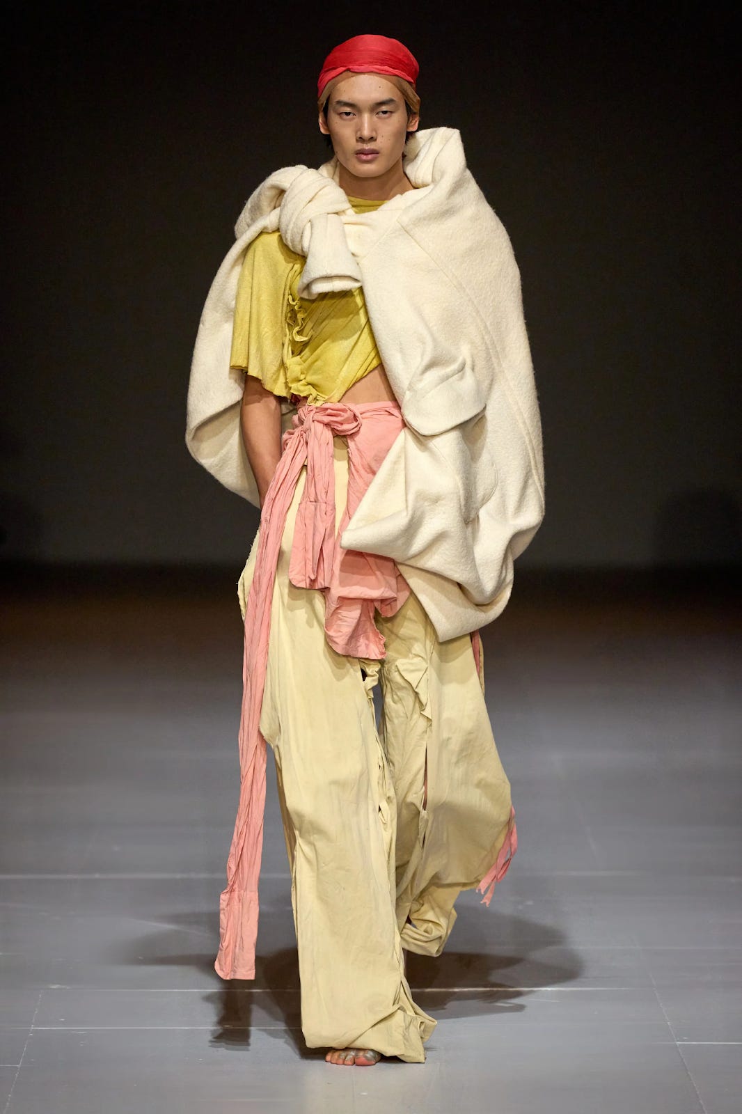 We wouldn’t ever have occasion to wear it. Lack the posture and confidence to pull it off. Have nothing to wear with it. Would be anxious at every moment that it’d get dirty or ruined somehow. Cannot afford it. Would be shy about even going to see it in a store or something. Would never tell anyone we owned it. But we’ll be damned if that beige-y complex side-shawl isn’t the most appealing item of clothing we’ve seen in a long while. Adore it in such an unbridled way that we’ve come to hate mere sweaters or other lesser things that sit on shoulders. The whole collection is dope, but this… this is something else entirely. It looks like something a Muppet warrior would wear to a funeral in Fraggle Rock. Which, clearly, is a complimentary simile of the highest kind.